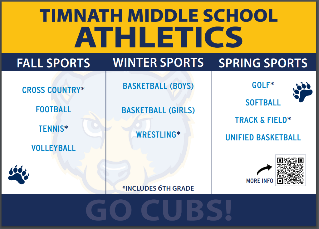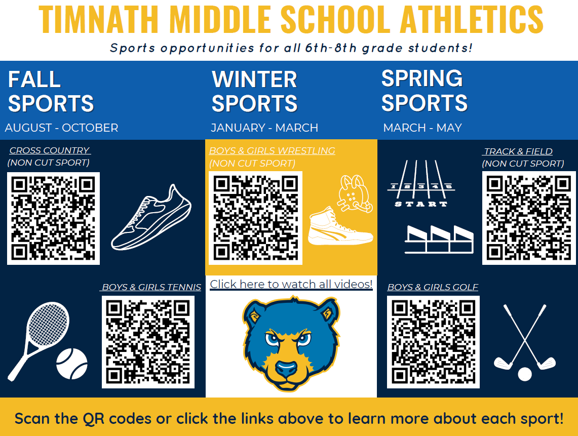Timnath Middle School Athletics offerings to ALL 6th - 8th graders: CLICK HERE to access the links to the videos